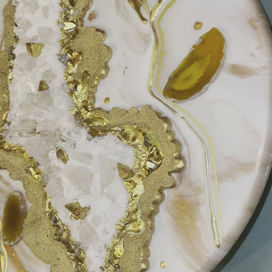 Colors are shades of three different shades of Gold and white. This piece has 3 layers of resin colors applied to create this wonderful depth. Two slices of healing agate geode stones.