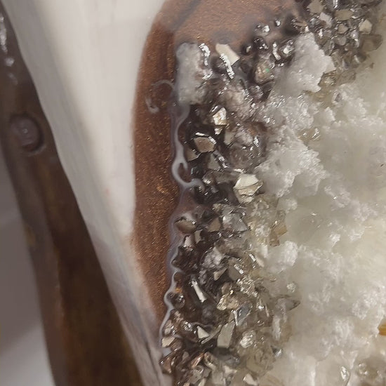 16x16 Handmade Geode Resin Wall Art with tigers eye, clear crystal quartz, and broken glass. Tiger's eye is known for its healing properties. The yellow gold color of the brown tiger's eye or the honey tiger's eye instills clear thinking, confidence, and willpower, helping with your personal life. Many people turn to tiger's eye no matter the variety to help detox the blood, to bring about good luck, courage, confidence, and emotional centeredness.