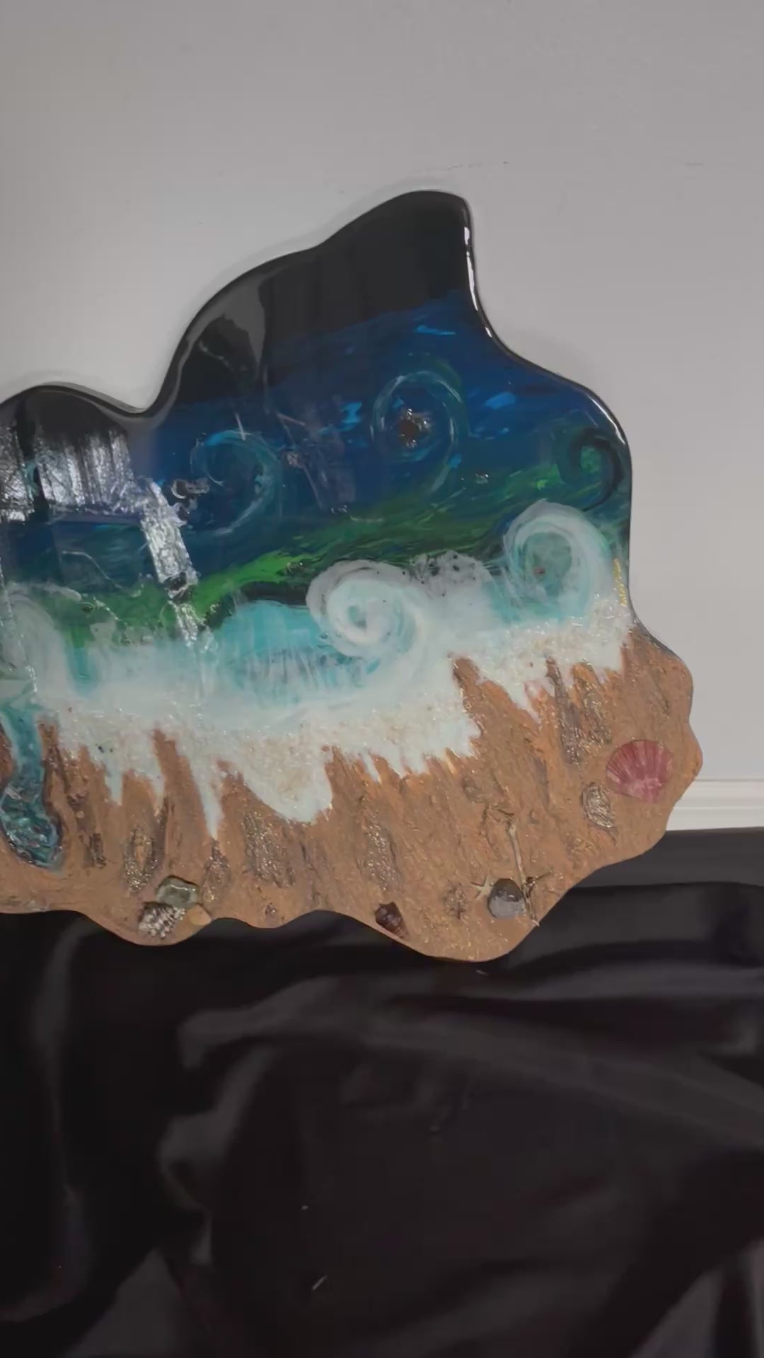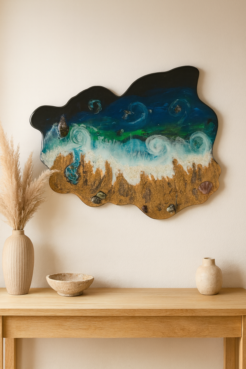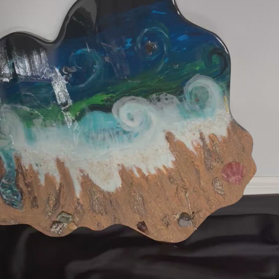 Handcrafted into a one-of-a-kind organic shape (29×25), this resin artwork captures the movement of the ocean using real sand and sea shells. A statement piece inspired by nature’s rhythm.